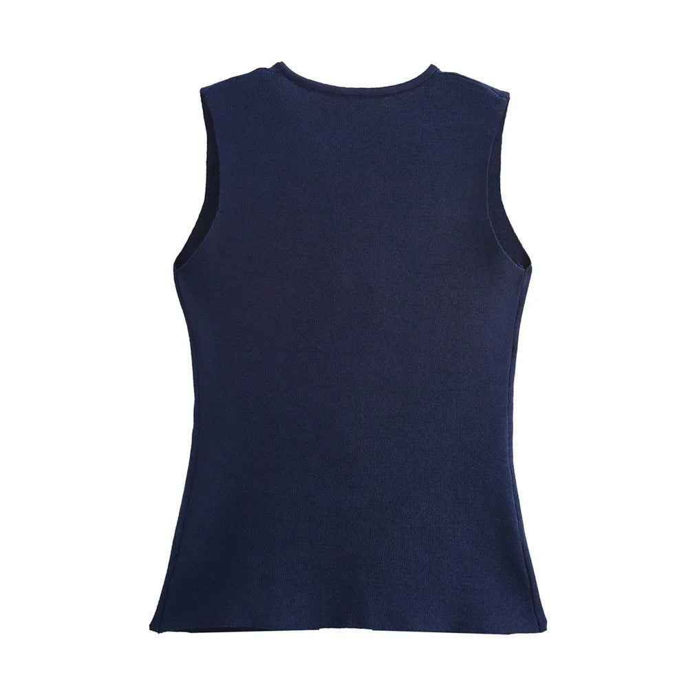 بلوزة نسائية بدون أكمام برقبة على شكل حرف V منسوجة ومكشكشة - بلوزة علوية بدون أكمام مزودة بأزرار معدنية